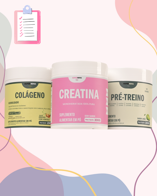 A creatina aumenta a força e melhora a performance nos treinos, o pré-treino dá energia e foco imediato, e o colágeno fortalece pele, unhas e articulações.